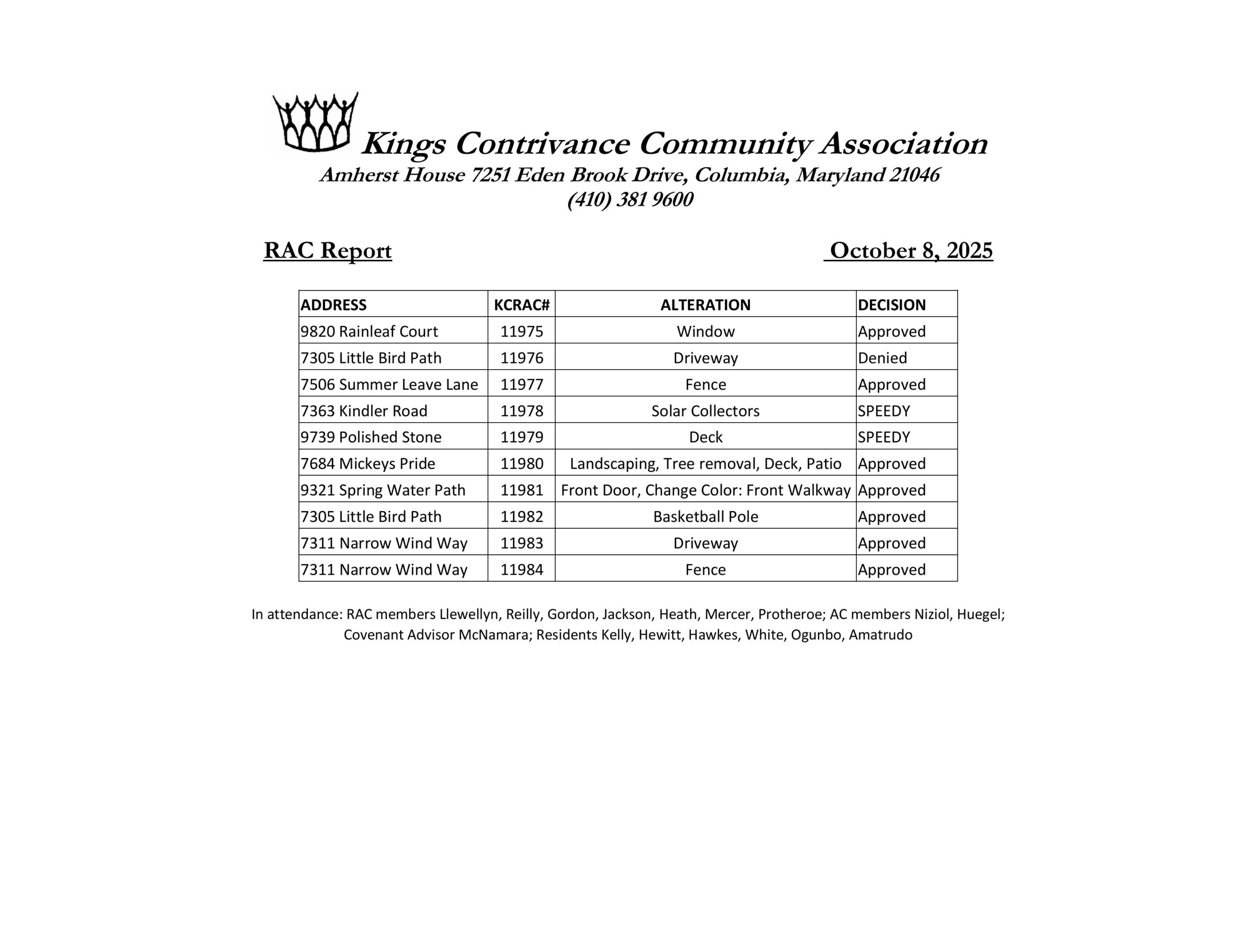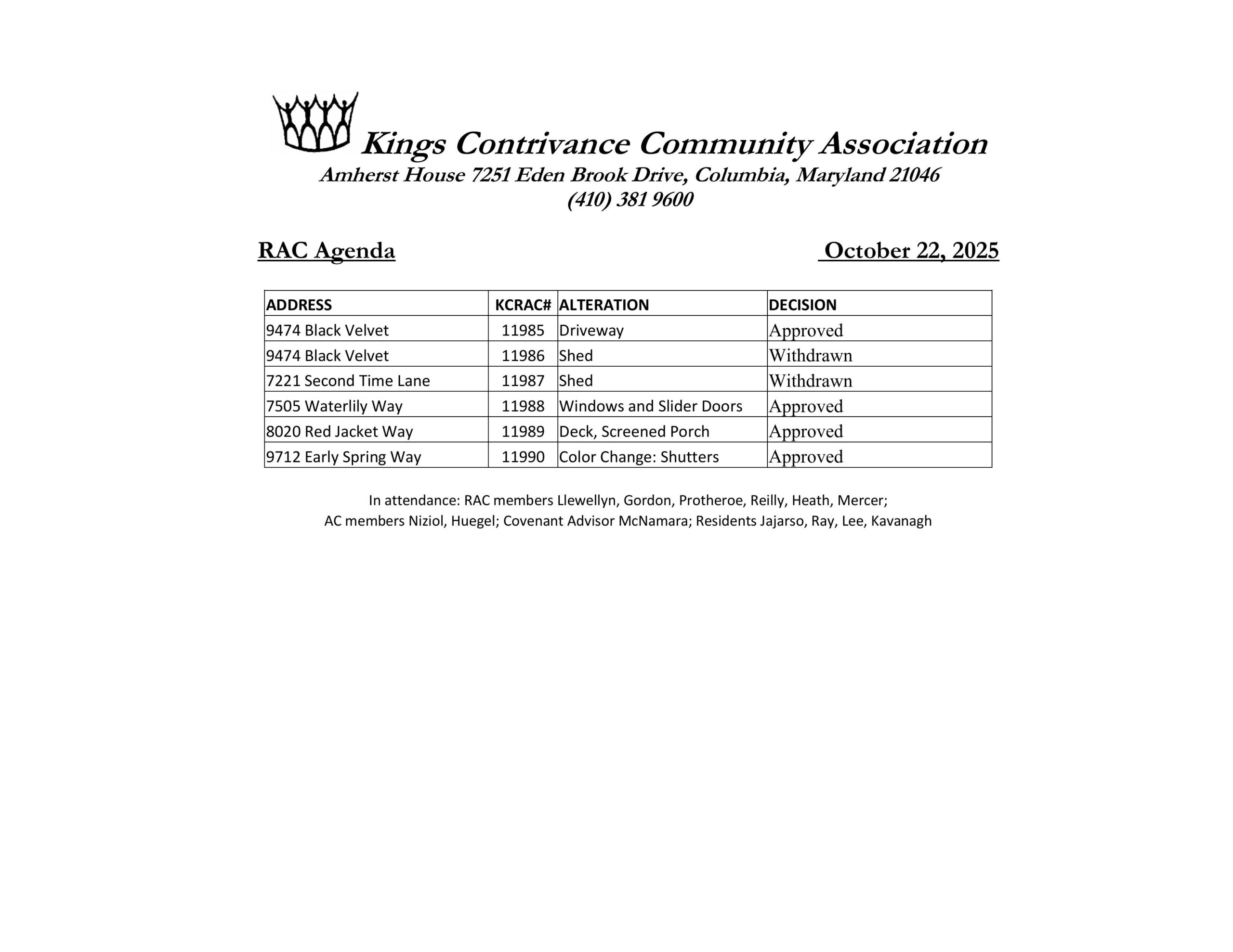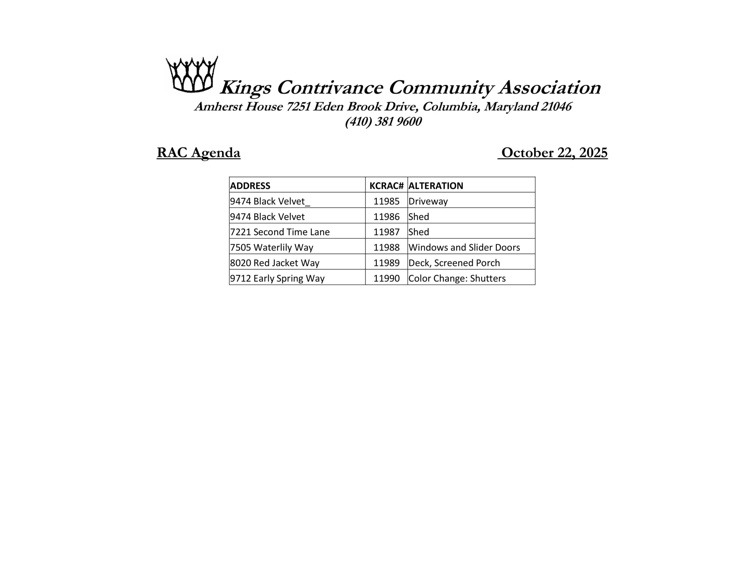 - Contact the Covenant Advisor at covenants@villageofkc.org or 410-381-9600 with any questions or concerns. Applications eligible to be reviewed under the speedy process (only certain alterations are eligible for speedy review and eligibility will be determined by the Covenant Advisor) must be submitted weekly by Monday at 10:00 a.m. These applications will be reviewed by the Architectural Committee sign-off person.