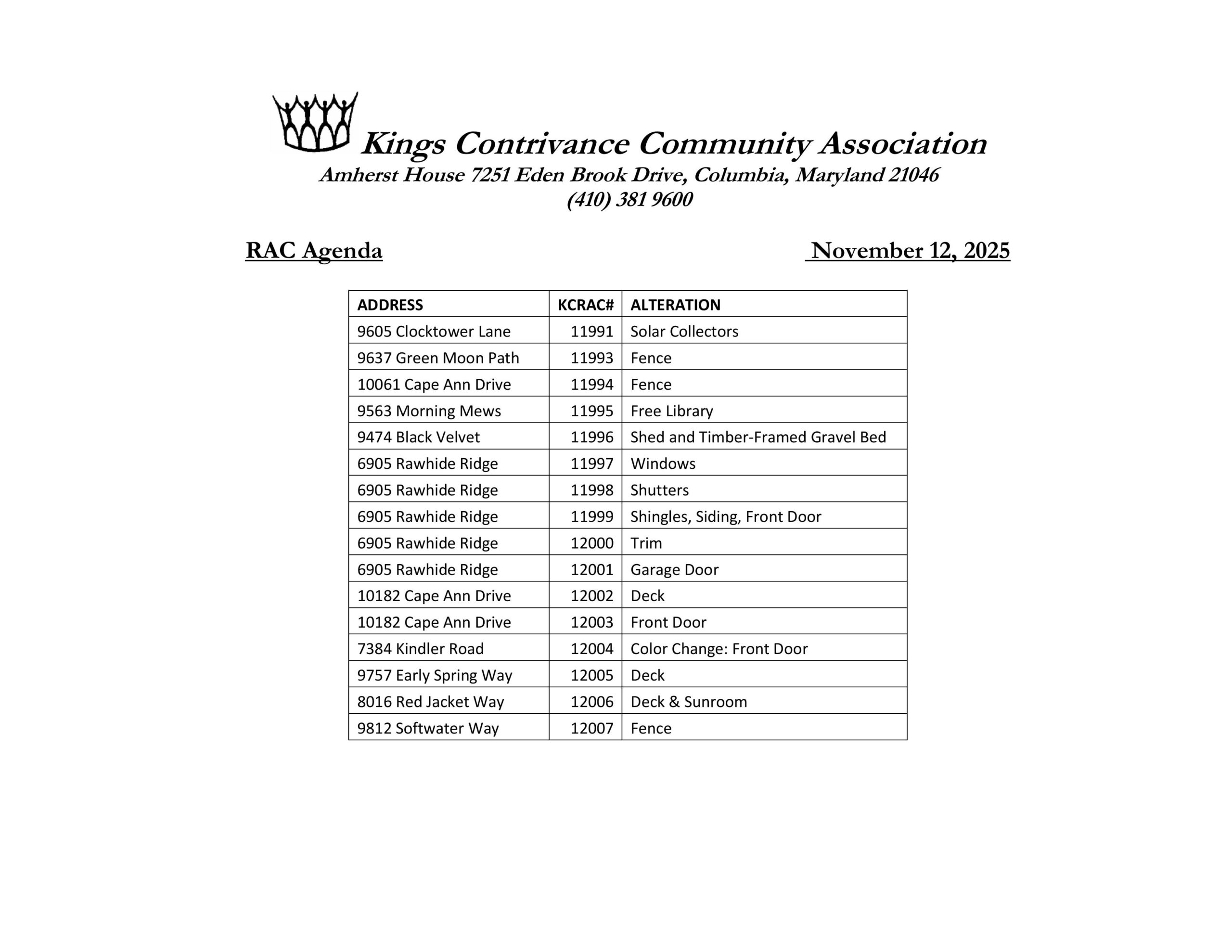 The agenda for the next virtual Resident Architectural Committee meeting is available. Please see link below. To request an invitation to attend the meeting, please email covenants@villageofkc.org.