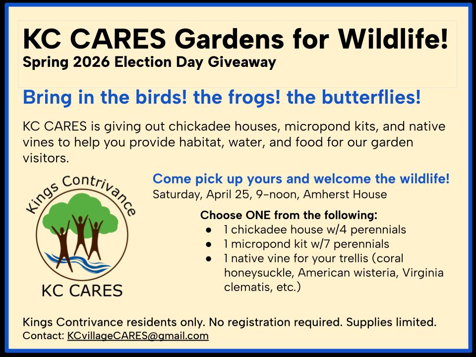 Spring Community Yard SaleSaturday, April 25 9:00 am to 12:00 pm KC CARES Gardens for WildlifeSaturday, April 25 9:00 am to 12:00 pm